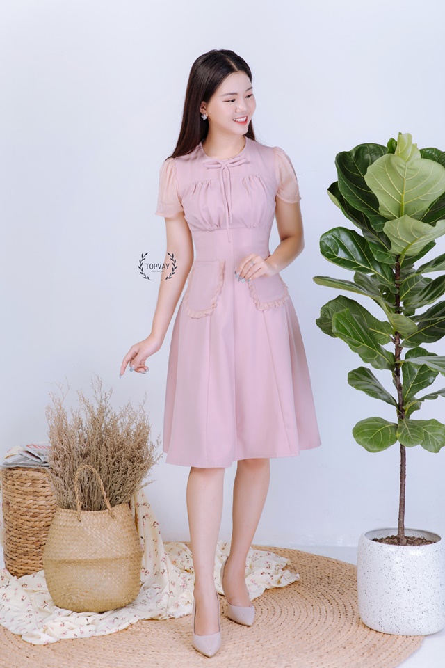 Váy xòe hồng nhún ngực phối tay voal – V1682